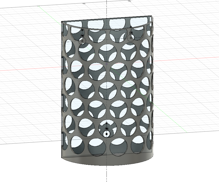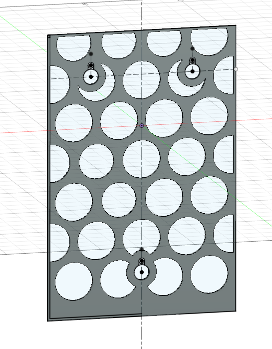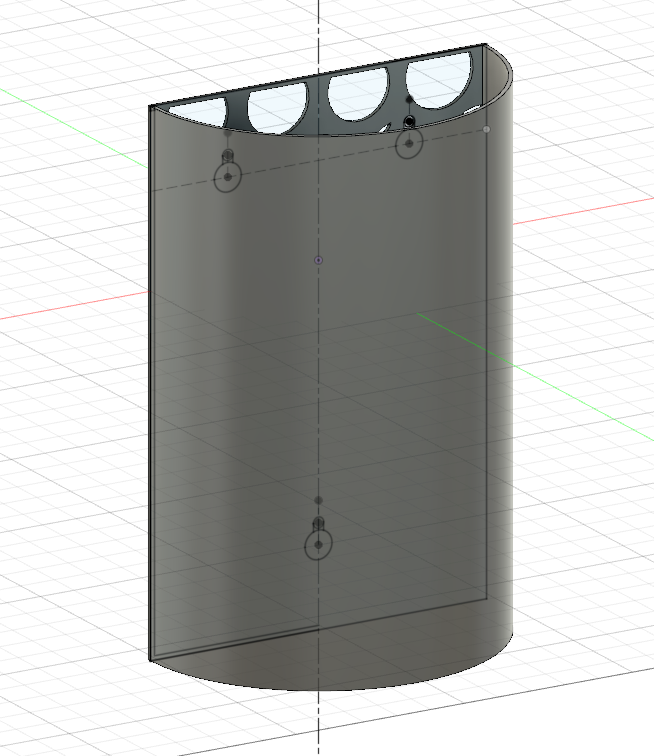 Mir schwebt vor, die Flaschenform des Brettes etwas hervorzuheben, mich zumindest daran zu orientieren. Also einen Halbzylinder zu verwenden. Dieser soll durch Schraubenslots in dem Brett eingehakt werden können, damit man den Behälter durch eine Bewegung nach oben vom Brett lösen und den Inhalt entsorgen kann. Diese hintere Seite wird noch durch ein Löchmuster etwas aufgebrochen.