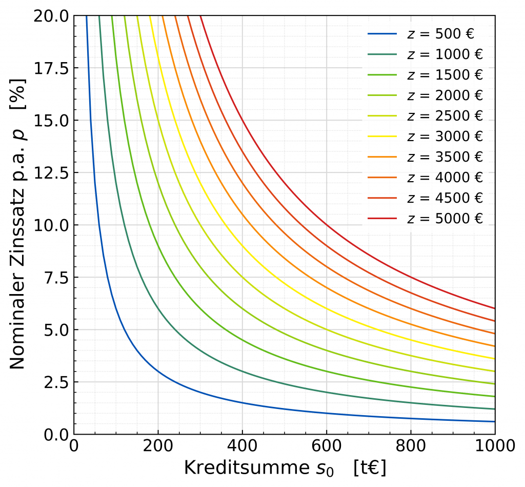 Die Grenzrate, bzw. die monatliche Zinslast z hängt also von zwei Parametern ab. Wir können nun fixe Werte der monatlichen Zinslast z vorgeben, und uns ansehen, welche Kombinationen des nominalen Zinssatzes p.a. p und der Anfangskreditsumme s0 hier zu finden sind. Dazu einmal kurz umgestellt